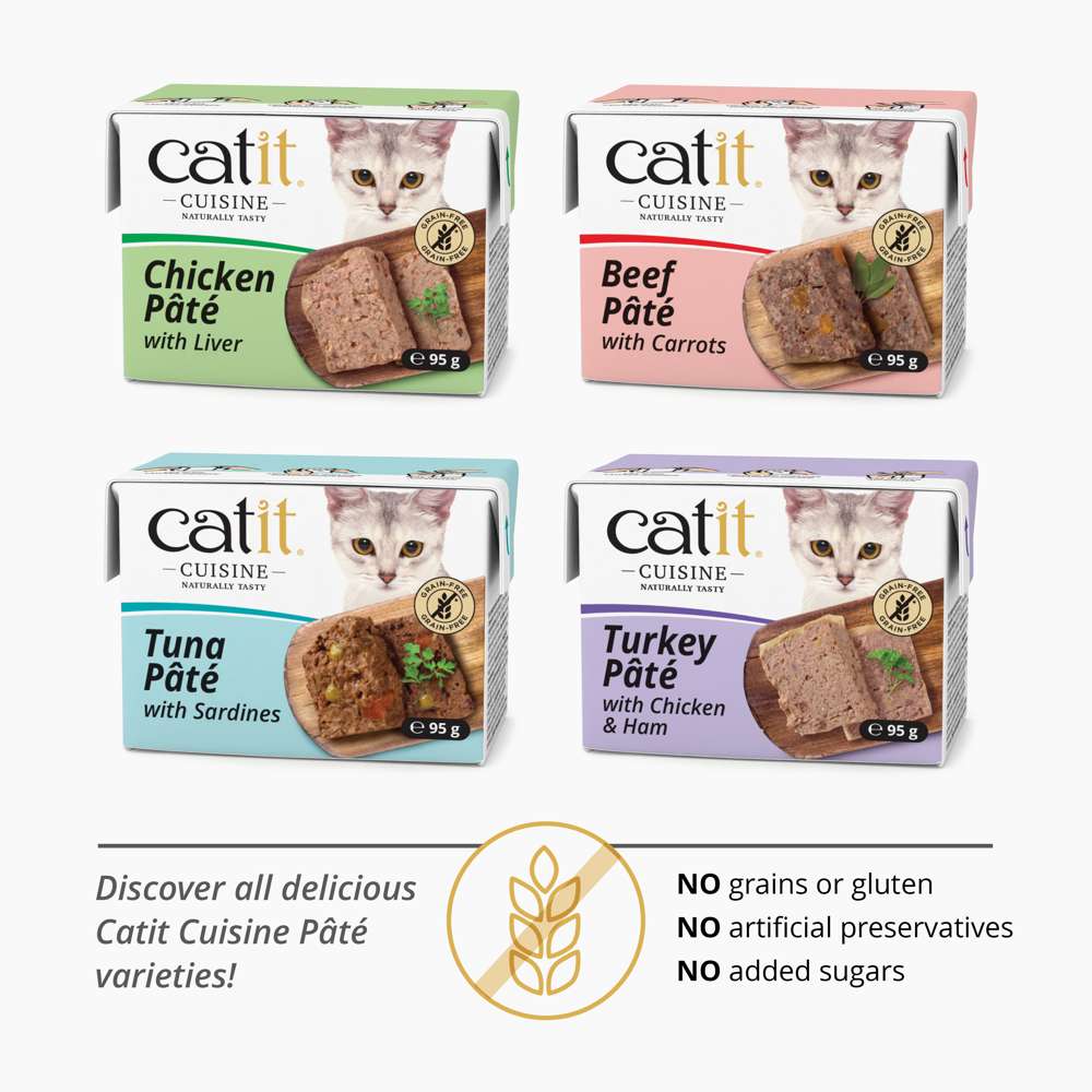 Discover the four tasty Pâté varieties that include Turkey, Ham, Beef or Tuna. There's a Catit Cuisine Pâté for even the fussiest of felines.