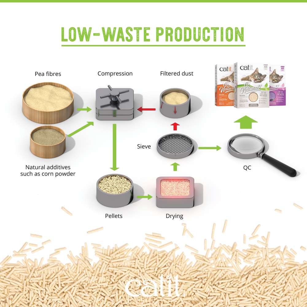 Catit Go Natural! Pea Husk Clumping Cat Litter can absorb up to 3 times its own weight! We recycle empty pea husks that would otherwise get discarded, and mix in raw, food-grade materials. The result is a beautiful and highly absorbent litter that clumps naturally without a speck of dust!