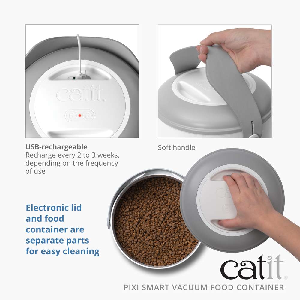 Using the touch controls in the electronic top lid, air is extracted from the food reservoir, creating an airtight seal around the kibble. The clever lid then automatically detects and maintains the vacuum to keep food fresh and tasty.