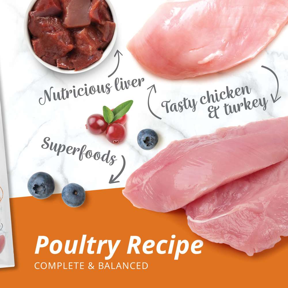 Composition: Poultry (57%) (fresh turkey meat 28%, fresh chicken meat 20%, dried poultry protein 9%), liver (10.5%) (fresh liver 8%, liver meal 2.5%), potato flour, brown rice, dried sweet potato, dried peas, hydrolysed protein, fish oil, calcium carbonate, psyllium (0.15%), green lipped mussel extract, dried cranberries (0.12%, equivalent to 0.7% cranberries), dried blueberries (0.12% equivalent to 0.7% blueberries), dried yeast, dried marigold blossoms (0.06%), dried chicory, dried yucca (0.005%).