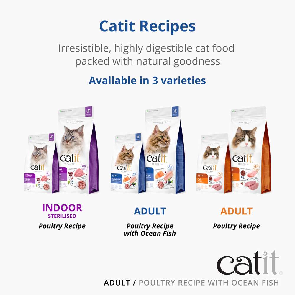 Formulated with 80% animal protein, Catit Recipes Adult Poultry with Ocean Fish is a gentle, highly digestible recipe that supports cats with sensitive stomachs while promoting energy, skin health, and overall wellbeing. Cooked gently at lower temperatures to preserve nutrients and flavour, this premium kibble is made with locally sourced, natural ingredients only.