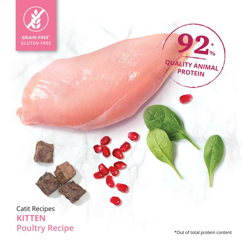 Formulated with 92% of its protein from high-quality animal ingredients, Catit Recipes Kitten Poultry Dry Cat Food supports healthy growth and development during the most important stage of life. With fresh chicken, liver, and superfoods, this grain-free recipe provides highly digestible nutrition for kittens, as well as pregnant and nursing cats. Gently cooked at lower temperatures to preserve natural taurine, flavour, and nutrients.