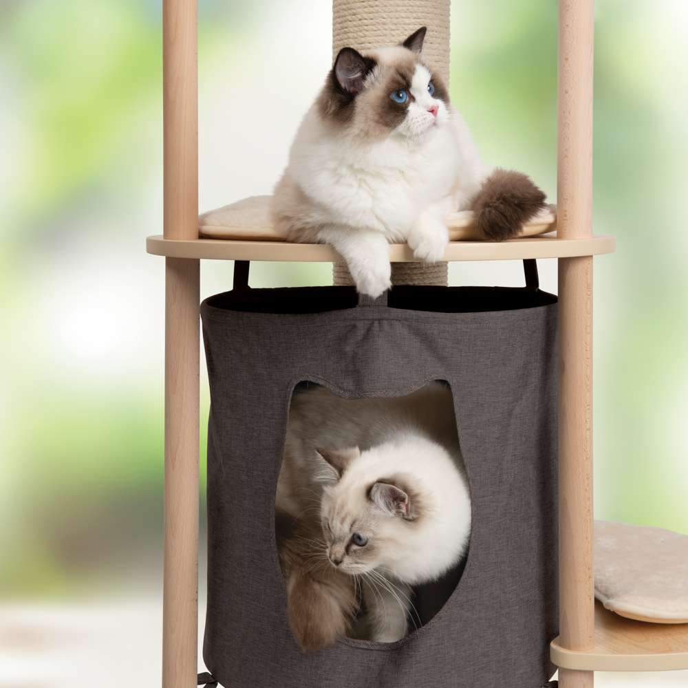Extra-thick sisal posts satisfy scratching instincts, while the stylish fabric hideaway, relaxing hammock perch, and soft memory foam cushions offer comfort and security. With wooden “branches” to attach toys, the Vesper Treehouse keeps curious paws and minds engaged all day long.
